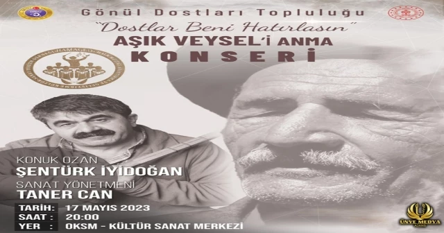 Ordu Valiliği tarafından HAMAGED Gönül Dostları Topluluğu Korosu "Dostlar Beni Hatırlasın" Aşık Veysel'i Anma Konseri, 17 Mayıs 2023 Çarşamba Saat: 20.00'de, Ordu Kültür Sanat Merkezi Büyük Salonda, Sanat Yönetmeni Taner CAN yönetiminde Konuk Sanatçı Şentürk İYİDOĞAN'ın katılımıyla düzenlenecektir. Konsere Tüm Halkımız Davetlidir