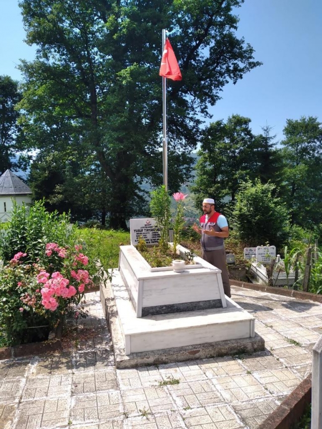Yapılan çalışmalarla vatandaşların kabir ziyaretini rahatlıkla yapmasını sağlayan Mezarlıklar ve Cenaze Hizmetleri Şube Müdürlüğü personeli, aynı zamanda büyük bir vefa örneği göstererek 15 Temmuz Demokrasi ve Milli Birlik Günü dolayısıyla vatan uğruna şehit olan şehitler için Kur’an-ı Kerim tilaveti okuyup, dualar ettiler.