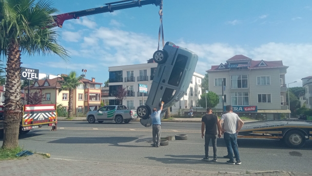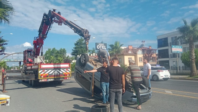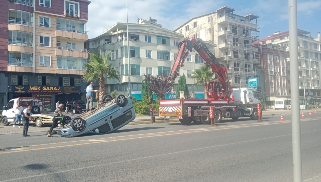 Ünye Devlet Sahil Yolu hızını alamayan araç ara yoldan çıkan araca çarpması sonucunda takla attı.