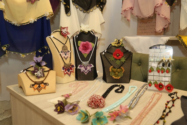 “Bunlar Japonya’dan ithal edilmiş çok düzgün boncuklar adları da Miyoki’dir. Öğrencilerimiz düzenli bir şekilde model model, şablon şablon çalışıldı. Kursiyerlerimize öğretiyoruz. Bu öğretimde onlarında merakı var tabi ki de. Doğal taşlarımız var, kasnakta okuma bilekliklerimiz var, birbirinden güzel ve doğal taşlarla beraber olan farklı ürünlerimiz var. Deri üzerine işlediğimiz ürünlerimiz var. Kehribar olarak bilinen doğal taş işlemelerimiz var. Doğal taşlardan kehribar yetişkinlerde ağrı ve strese, bebeklerde ise diş çıkarmalarında kullanılıyor ve tercih ediliyor. Bu kısımda sitrik taşlarımız var bolluk ve berekettik anlamına geliyor ve bu taş kolye, cüzdan taşı olarak kullanılıyor. Kaplan Gözü taşımız var. Güç ve cesareti anlatan bir taş bu ve bunu erkekler genelde tercih ediyor.” ifadelerini kullandı.