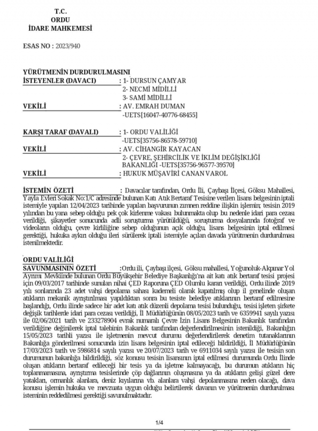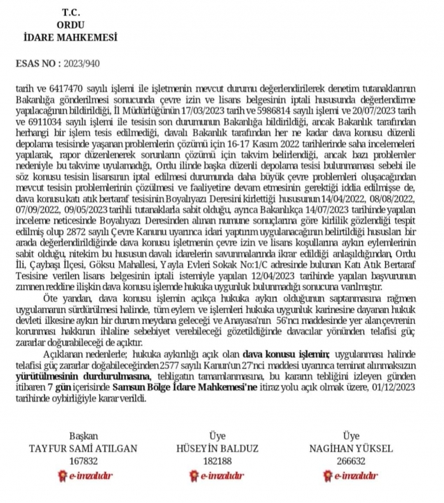 ORDU İDARE MAHKEMESİ ÇÖP TESİSİNDE YÜRÜTMEYİ DURDURMA KARARI VERDİ