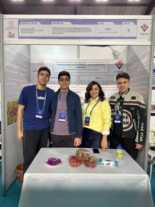 Projeyi hazırlayan Sancak Kılıç, Göktürk Burak Öztürk ve Emirhan Demir, atıkların katma değerli ürüne dönüşümü konusunda örnek bir çalışmaya imza attı. Artan nüfus ve gıda güvenliği sorunlarına getirdikleri bu yenilikçi yaklaşım, jüri üyelerinden tam not aldı.