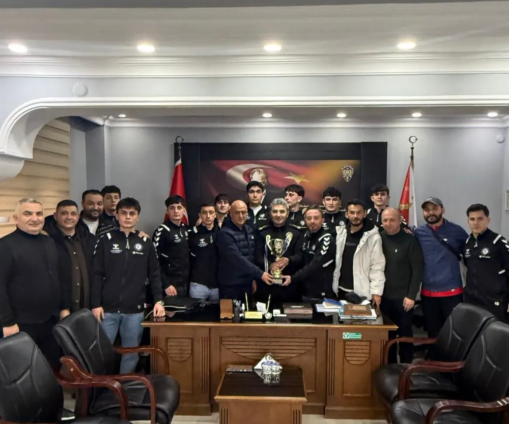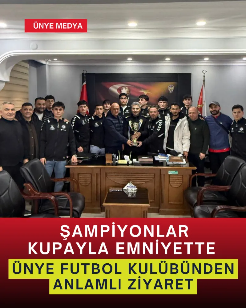 Mavi-siyahlı ekibin yönetimi, teknik heyeti ve sporcuları, Ünye İlçe Emniyet Müdürü Celal Sarısoy’u makamında ziyaret ederek şampiyonluk kupasını takdim etti.