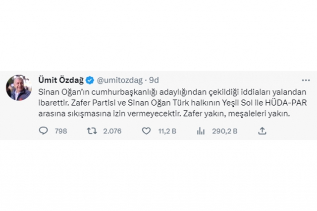 Memleket Partisi lideri Muharrem İnce'nin adaylıktan çekilmesinin ardından ATA İttifakı'nın adayı Sinan Oğan'ın da adaylıktan çekileceği iddiası Ankara kulislerine bomba gibi düştü. Basında yer alan iddialara cevap veren Zafer Partisi lideri Ümit Özdağ, "Sinan Oğan'ın cumhurbaşkanlığı adaylığından çekildiği iddiaları yalandan ibarettir. Zafer Partisi ve Sinan Oğan Türk halkının Yeşil Sol ile HÜDA-PAR arasına sıkışmasına izin vermeyecektir. Zafer yakın, meşaleleri yakın" ifadelerini kullandı.