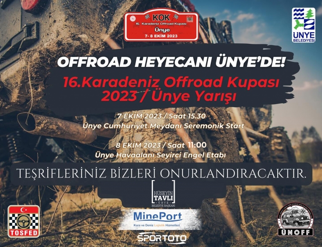 Ünye Belediyesi’nin destekleriyle Ünye Yunus Emre Off -Road Kulübü (ÜNOFF) tarafından organize edilen Türkiye Otomobil Sporları Federasyonu 16. Karadeniz Off-Road Kupası 07-08 Ekim 2023 tarihlerinde gerçekleştirilecek. 07 Ekim’de Cumhuriyet Meydanı’nda saat 15.30’da Seromonik Start ile başlayacak yarışlar, 08 Ekim Pazar günü Havaalanında devam edecek.