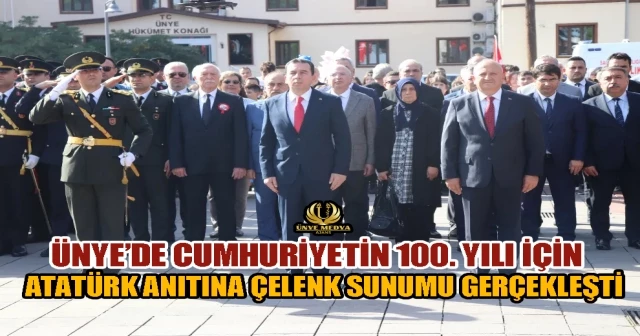 Ünye’de Cumhuriyet’in 100. Yılı kutlama programları kapmasında Atatürk Anıtına çelenk sunma töreni gerçekleştirildi.