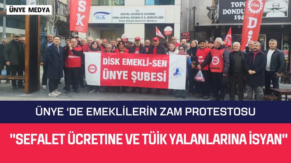 Devrimci Emekliler Sendikası ( DİSK ) Ünye Şubesi, Ocak 2026’da emekli ve memur maaşlarına yapılacak zam oranlarını “sefalet ücreti” olarak nitelendirerek Ünye Döner Çeşme Meydanı’nda bir basın açıklaması düzenledi. Eyleme CHP Ünye İlçe Başkanı İsa Maral ve yönetimi ile Saadet Partisi üyeleri de katılarak dikkat çekici bir siyasi tablo oluşturdu.