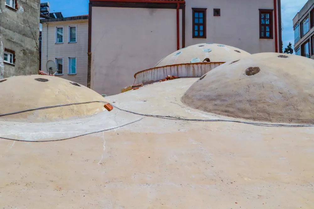 Tarihi hamamın kubbe ve taş işlemeleri sıva ve boyalarından temizlenerek orijinal haline getirildi.