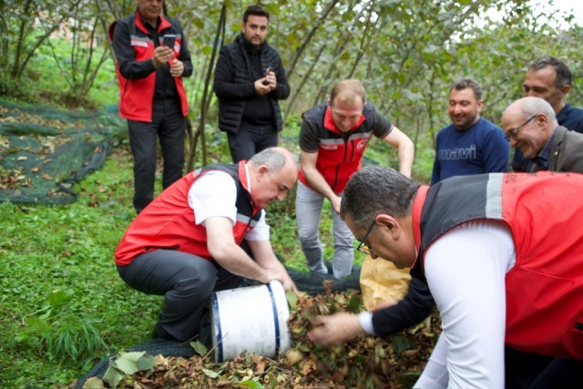 Bahçede hasat yapan işçilere kolaylıklar dileyen Vali Erol, beraberindekilerle file üzerinde bulunan fındıkları topladı.