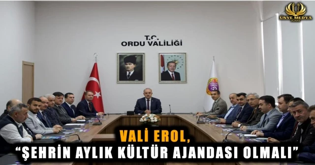 Ordu’da yapılacak kültürel etkinliklerin herkese ulaşabilecek bir formata getirilmesi gerektiğine de vurgu yapan Vali Erol, “Şehrin kültür hayatına neler katabiliriz? Hep birlikte buna kafa yormalıyız. İl’de düzenlenecek kültürel etkinliklerden haberdar olunabilecek tek bir adres olmalı. Şehrin aylık kültür ajandası olmalı. Bu konuda kurumlar bir araya gelip, aylık kültür etkinlikleri takvimi oluşturulmalı. Hangi ay, hangi etkinliği, nerde yapacağımızı tek bir adresten duyurmalıyız” diye konuştu.