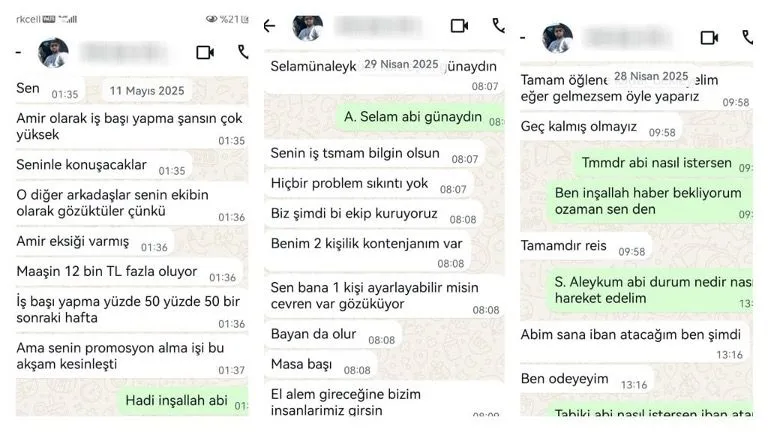 Oğlunun 8 kişiye iş vaadinde bulunduğu mesajları hatırlatılan baba İ.E., "Yarın karakola gideceğim ve oğlum dahil olmak üzere herkesi dolandırıcılıktan mahkemeye vereceğim. Hata yapan benim oğlum da olsa cezasını çeksin" dedi. M.C.E. ise, bir arkadaşının bankayla ilgili sorunu olduğu için paraların kendi hesabına yattığını ve kendisinin de arkadaşına gönderdiğini savundu.