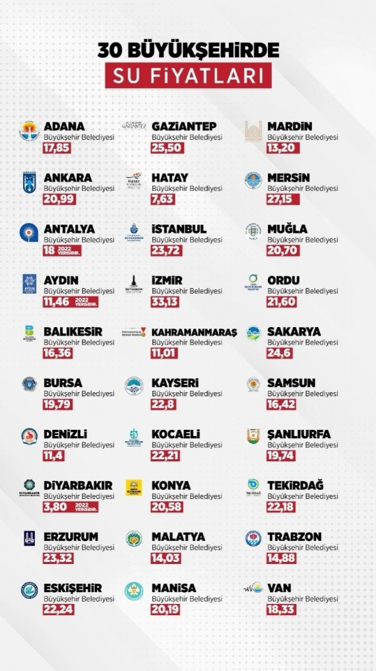 İşte 30 büyükşehir ve su faturalarının ton üzerinden fiyat listesi: