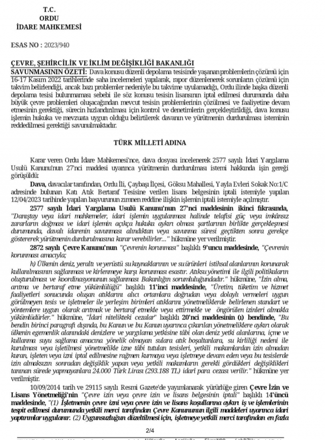 Ordu Büyükşehir Belediyesi’nin çöp tesisinin dereyi kirletmesi üzerine uyarılara rağmen önlem almaması nedeniyle açılan dava sonucu Ordu İdare Mahkemesi, çöp tesisinin telafisi olanaksız zararlar vereceği gerekçesiyle “yürütmeyi durdurma” kararı verdi.