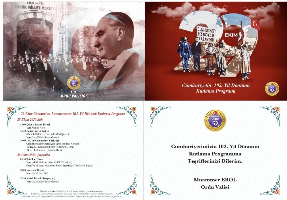 28 Ekim 2024 Salı günü saat 13.00’de Atatürk Anıtına Çelenk Sunma Töreni ile başlayacak olan Cumhuriyet Bayramı Kutlama Programı; aynı gün saat 13.30’da Ordu Kültür ve Sanat Merkezinde İl Kültür ve Turizm Müdürlüğünce düzenlenen Resim Sergisi, saat 19.00’da ise 102. Yıl Cumhuriyet Yürüyüşü ve OBB Şehir Bandosu Konseri ile devam edecek. Cumhuriyet Bayramı Kutlama Programı; 29 Ekim 2024 Çarşamba günü saat 09.30’da Valilik Makamında Vali Muammer Erol tarafından Tebriklerin Kabulü (Tebrikat Töreni), aynı gün saat 10.00’da Ordu Lisesi önündeki alanda Kutlama Töreni, saat 19.30’da ise Ordu Kültür Sanat Merkezinde yapılacak Cumhuriyet Resepsiyonu (Kabul Töreni) ile son bulacak.Cumhuriyetin 102. yıl dönümü münasebetiyle kapsamlı bir kutlama programı hazırlandığını belirten Vali Muammer Erol, tüm etkinlik ve programlara vatandaşların davetli olduğunu ifade ederek, etkinlik ve programların yüksek bir katılım ve coşkuyla gerçekleştirmeyi arzu ettiklerini söyledi.