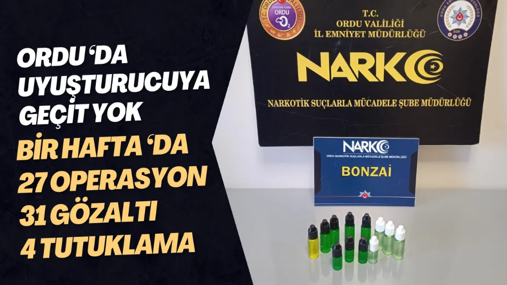 12.01.2026-18.01.2026 TARİHLERİ ARASI NARKOTİK SUÇLARLA MÜCADELE ŞUBE MÜDÜRLÜĞÜ toplamda 27 operasyon yapmış 31 kişi yi gözaltına almış gözaltına alınan ların içerisinden 4 tanesi çıkarıldığı mahkemece tutuklanarak ceza evine gönderilmiştir.