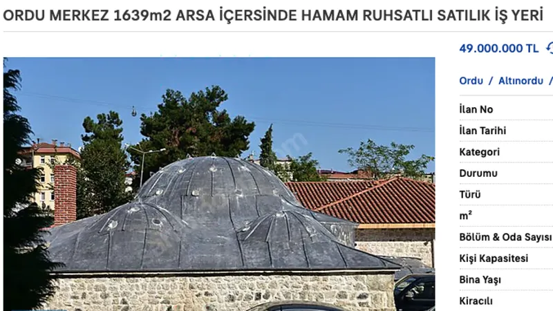 Ordu'nun tarihi dokusunun önemli parçalarından biri olan yapılar, ticari satışlara konu olmaya devam ediyor. Son olarak Altınordu ilçesine bağlı Selimiye Mahallesi'nde yer alan tarihi bir hamam, popüler alışveriş platformu Sahibinden.com üzerinden satışa çıkarıldı. Özel tapulu olduğu belirtilen bu tarihi yapı için ilan sahibi tarafından 49 milyon TL değer biçildi.