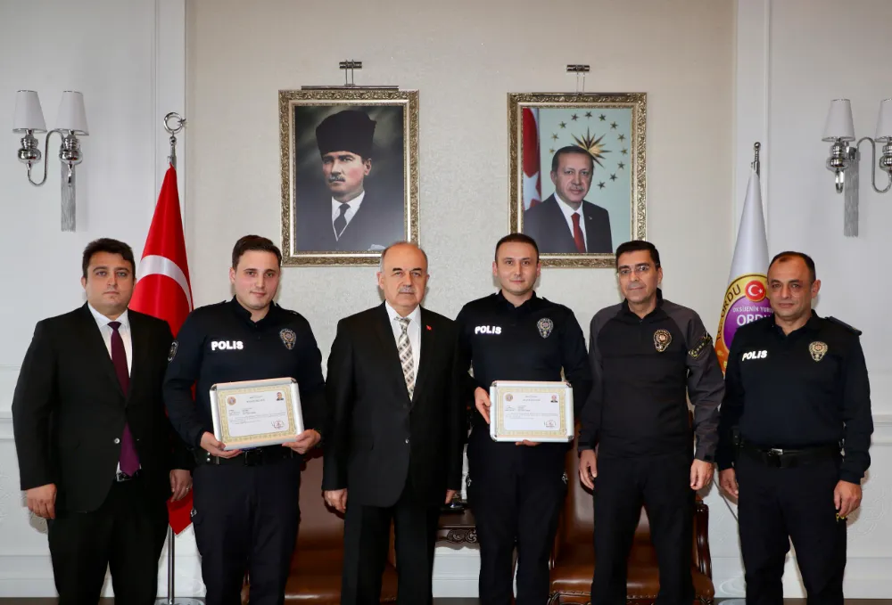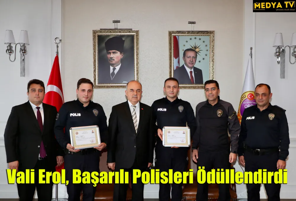 Vali Muammer Erol, Gülyalı ilçesinde yol uygulamasında hakkında 26 yıl 9 ay 21 gün hapis cezası bulunan şahsın 1 dakika içerisinde yakalanması dolayısıyla Polis Memurları Osman Özdemir ile Niyazi Furkan Çelik’i “Başarı Belgesi” ile ödüllendirdi.