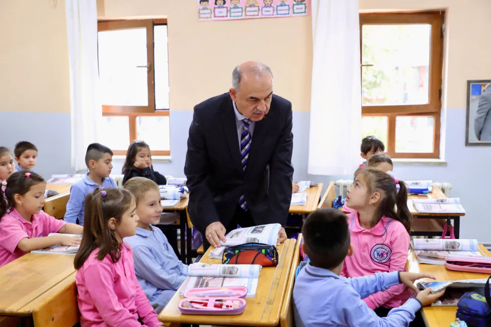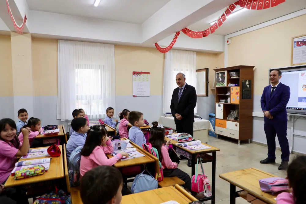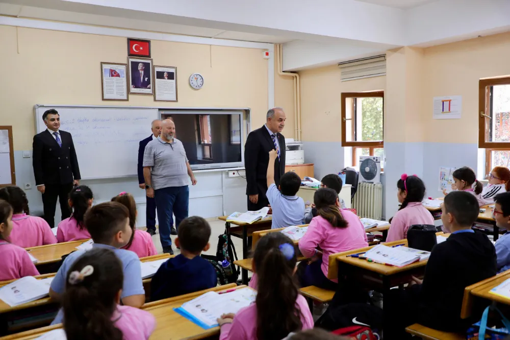Vali Muammmer Erol, girdiği her sınıfta minik öğrencilerin hal ve hatırlarını sorarak, 2024-2025 eğitim-öğretim yılının başladığı 9 Eylül tarihinden bugüne kadar geçen sürede derste neler öğrendiklerini sordu. Öğrenciler de Vali Erol’a merak ettikleri soruları yöneltti.