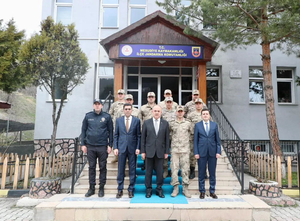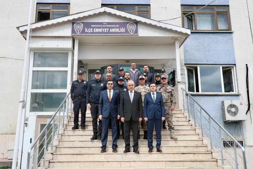 Beraberinde İl Emniyet Müdürü Atilla Aksoy ile birlikte ilk olarak Mesudiye Kaymakamlığını ziyaret eden Vali Muammer Erol, İlçe Kaymakamı Bahri Gökalp, İlçe Emniyet Amiri Muhammet Furkan Kapısız, İlçe Jandarma Komutan Vekili Astsubay Üstçavuş Beytullah Bayrak tarafından karşılandı.